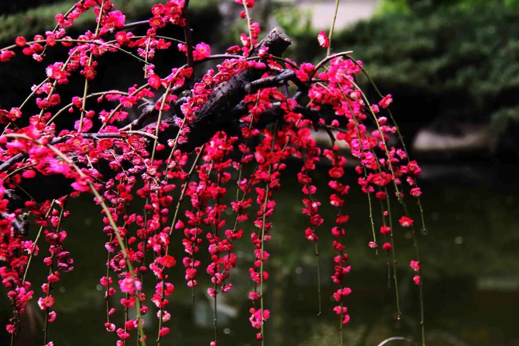 垂枝梅,因花枝自然下垂或斜垂而得名,花有紅、粉、白各色。